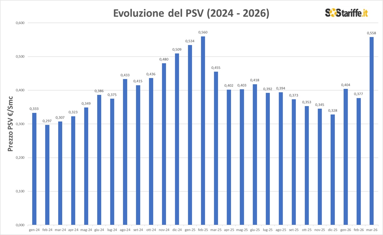 A oggi il valore del PSV ĆØ pari a 0,558 ā¬/Smc; si tratta del dato medio mensile relativo al mese precedente. Il prezzo medio del mese di aprile 2026 sarĆ definito nei primi giorni del mese successivo, come media dei prezzi giornalieri. Questo dato viene utilizzato dai fornitori per definire il prezzo del gas per i clienti che hanno attivato tariffe indicizzate.