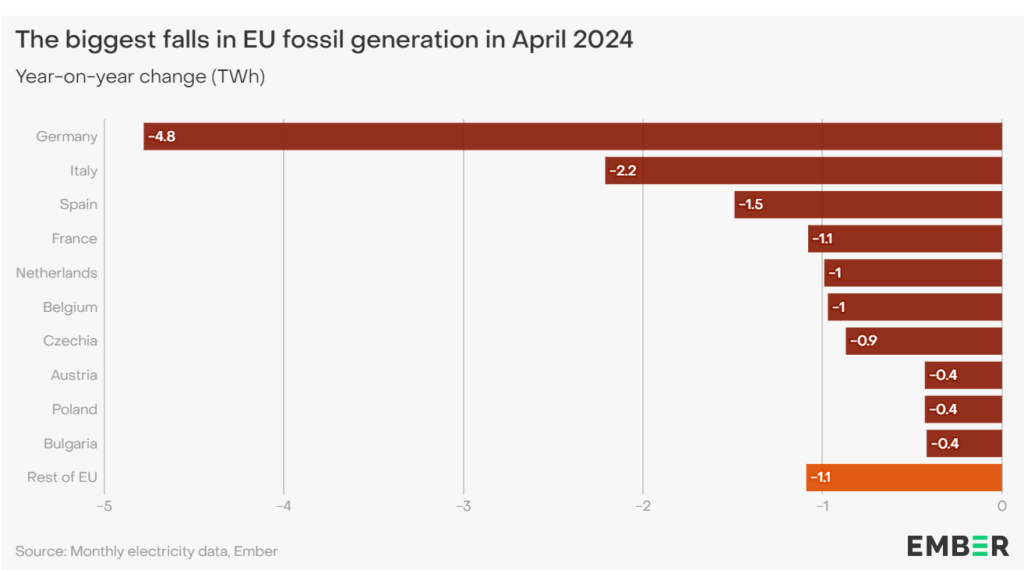 Dall’analisi del think tank Ember emerge che il tonfo della produzione da fonti fossili ad aprile 2024 è stato registrato in tutta Europa.