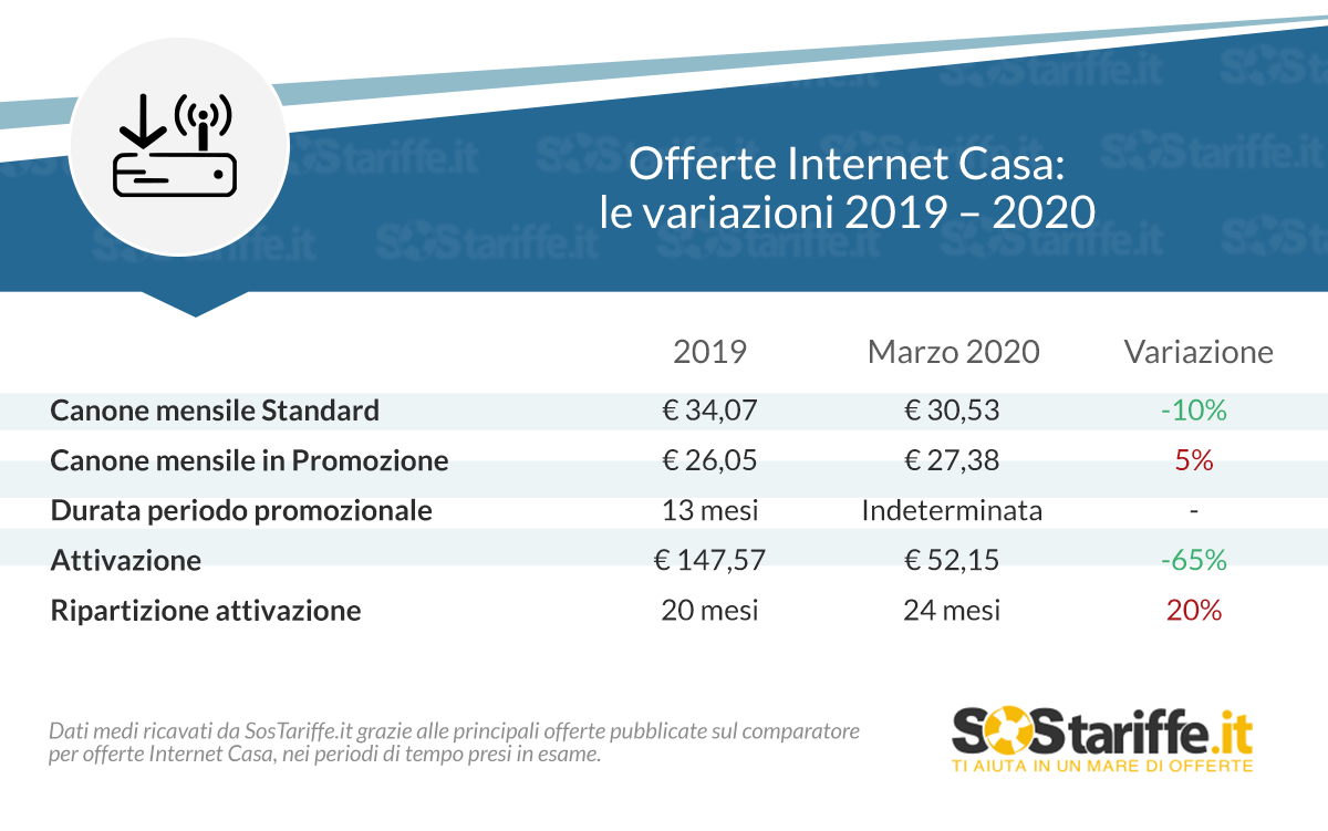 Il nuovo Osservatorio di SOStariffe.it in tema di offerte Internet casa conferma che nel mese di marzo 2020 si è registrato un netto calo dei costi da affrontare per attivare un nuovo abbonamento per Internet e il telefono di casa. In particolare, come evidenziato dallo studio, il confronto tra il marzo del 2019 ed il marzo 2020 segna un calo evidente dei costi di attivazione delle offerte. Da segnalare, inoltre, una riduzione sostanziale del canone mensile che, nel lungo periodo, può tradursi in un risparmio notevole per le famiglie italiane.