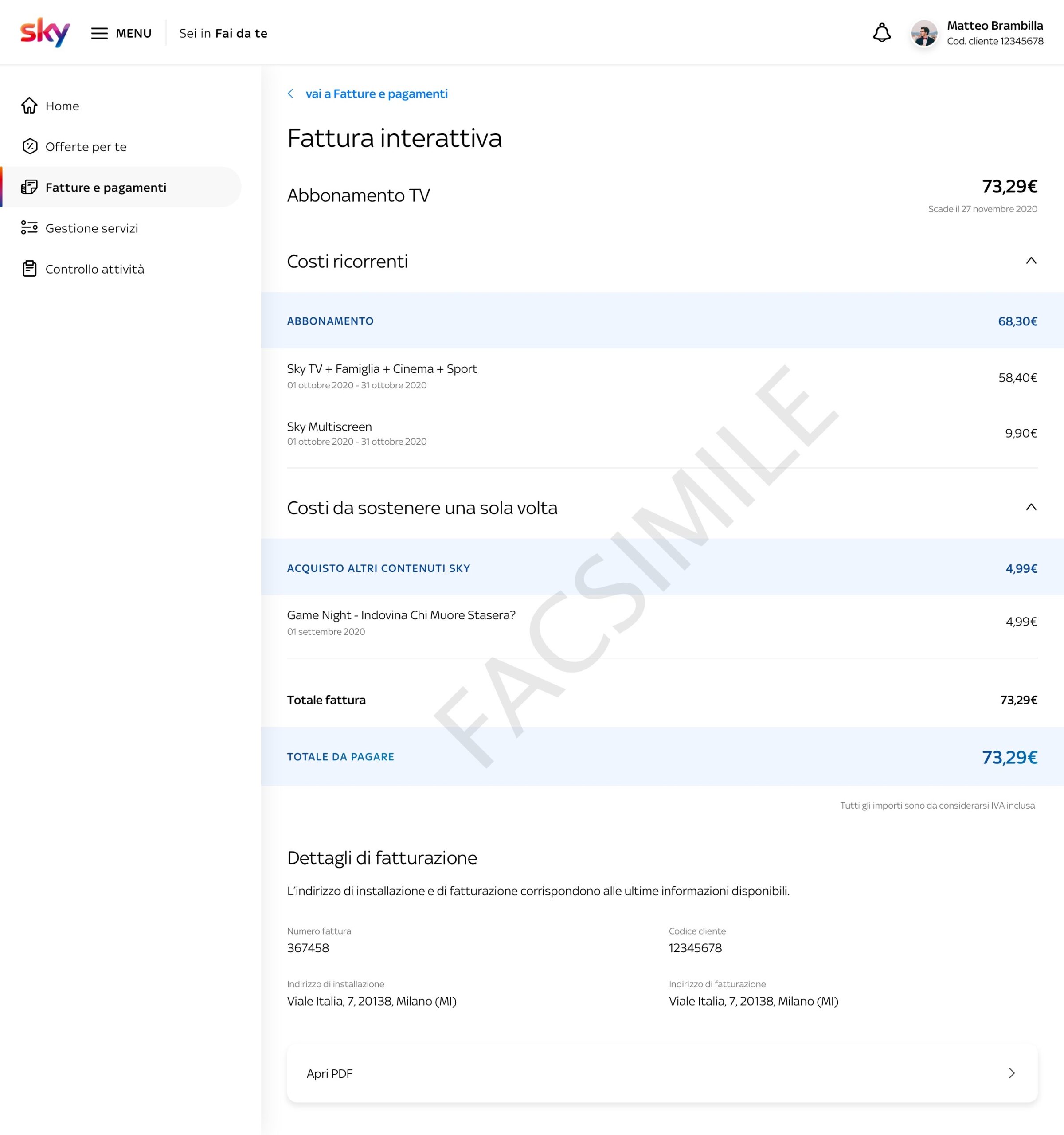 - una volta effettuato l’accesso, nell’area di gestione dell’abbonamento Sky sarà possibile visualizzare il proprio codice cliente.