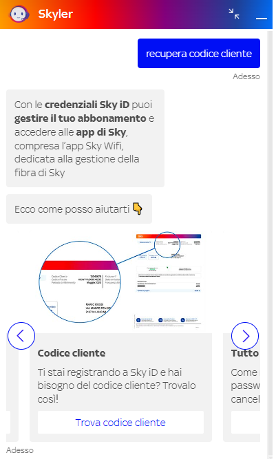 In alternativa, se si ha già lo Sky ID, è possibile recuperare il codice cliente anche chiedendolo a Skyler, l'assistente virtuali di Sky, digitando "recupera codice cliente".